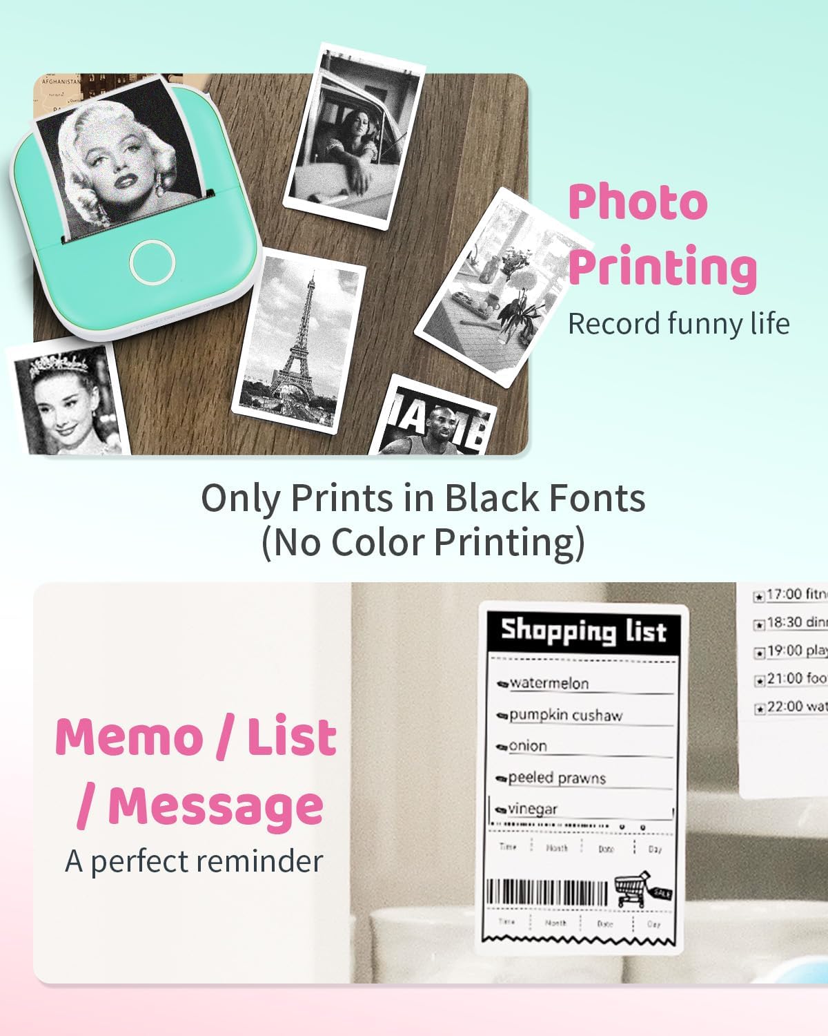 [New Stylish Gifts] Portable mini thermal printer – can be used to print black and white pictures. Be a great helper to decorate your journal more memorable, to cultivate children’s creativity, to make photos more stylish, to keep track of happiness moments at anytime and etc. Bluetooth mini photo printer for phone – can be an excellent gifts for children, students, teachers and DIY craftsman on Children’s Day or Thanksgiving day