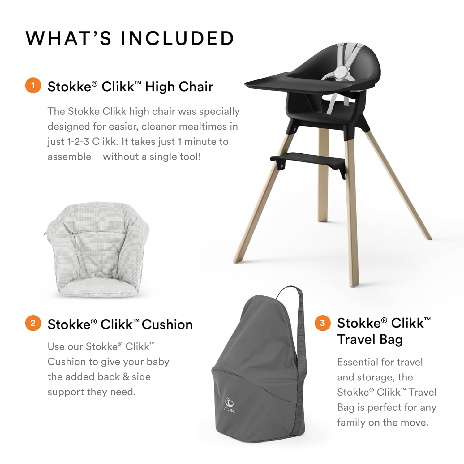 EVEN MORE TRAVEL FRIENDLY – Now the travel-friendly Stokke Clikk High Chair is even easier to travel with! This bundle includes our convenient, spacious Travel Bag with a hands-free carry handle, plus a Clikk Cushion in Nordic Grey.