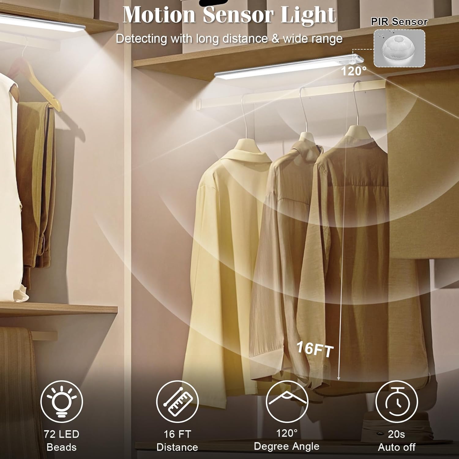 Upgraded Lighting Modes: These under cabinet lighting offer two motion sensing modes, Day Mode the closet light can detect and respond to motion in any brightness environment, Night Mode works only in darkness, smarter sensing modes meet your daily and nighttime needs flexibly; And both modes can detected the motion within 10ft/120°range and auto turn off after 20 seconds