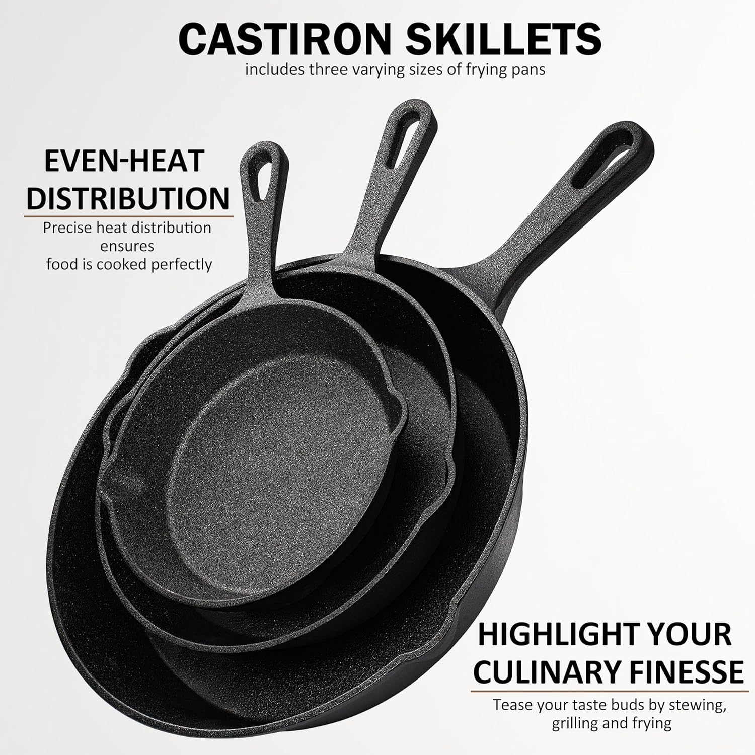 vivicreate Cast Iron Skillet Set of 3 – Pre-Seasoned Sartenes de Hierro Fundido – 6″, 8″, 10″ Frying Pans for Stove, Oven, Grill – Heavy Duty Sartén Hierro Fundido Cookware Set