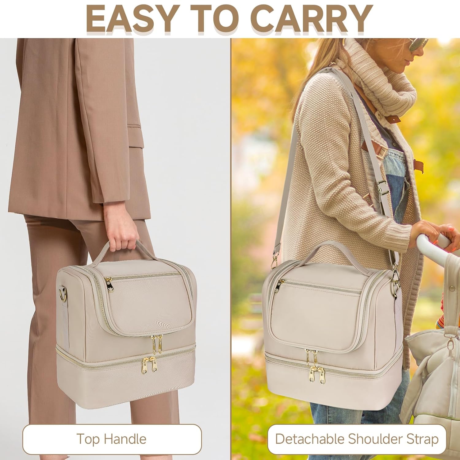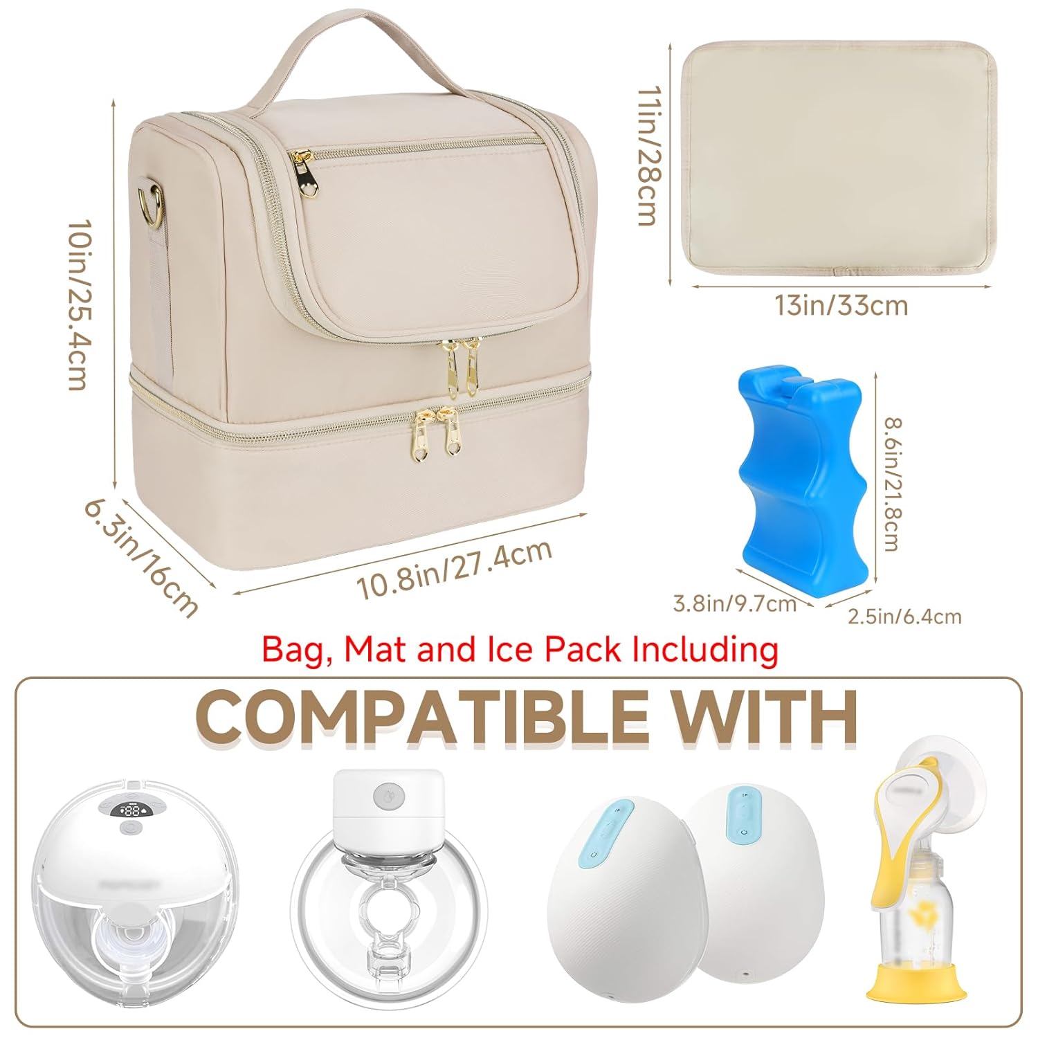 Wearable Breast Pump Bag with Cooler Compartment Fits for Willow/Elvie/Momcozy M5/S12 Pro/Medela, Breast Milk Travel Tote Bag with Ice Pack & Waterproof Mat,Apricot