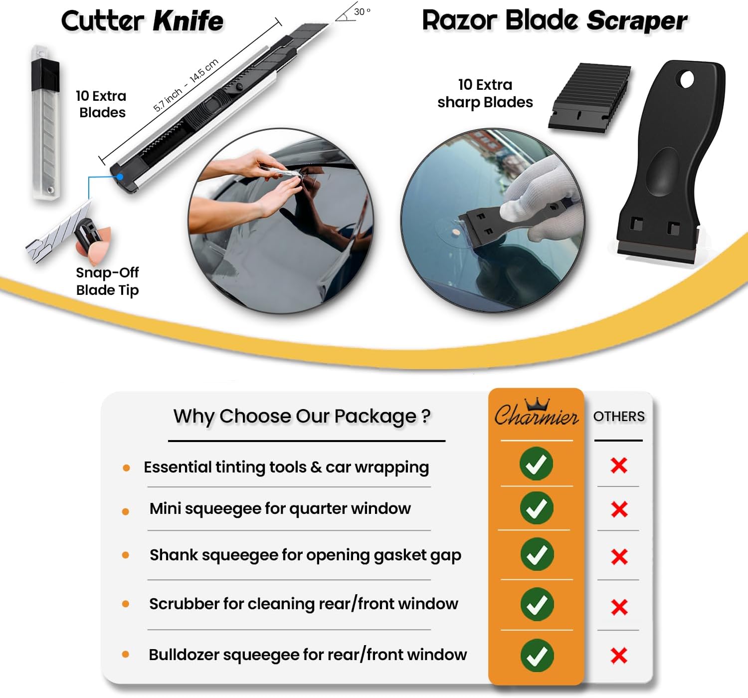 Professional Window Tint Car Kit: Our all-in-one window tint tools car wrapping kit includes all the essential tinting supplies you need for a flawless tint job. Perfect for beginners and pros, this car window tint kit ensures a smooth and bubble-free finish. Get the best out of your car tint kit now!