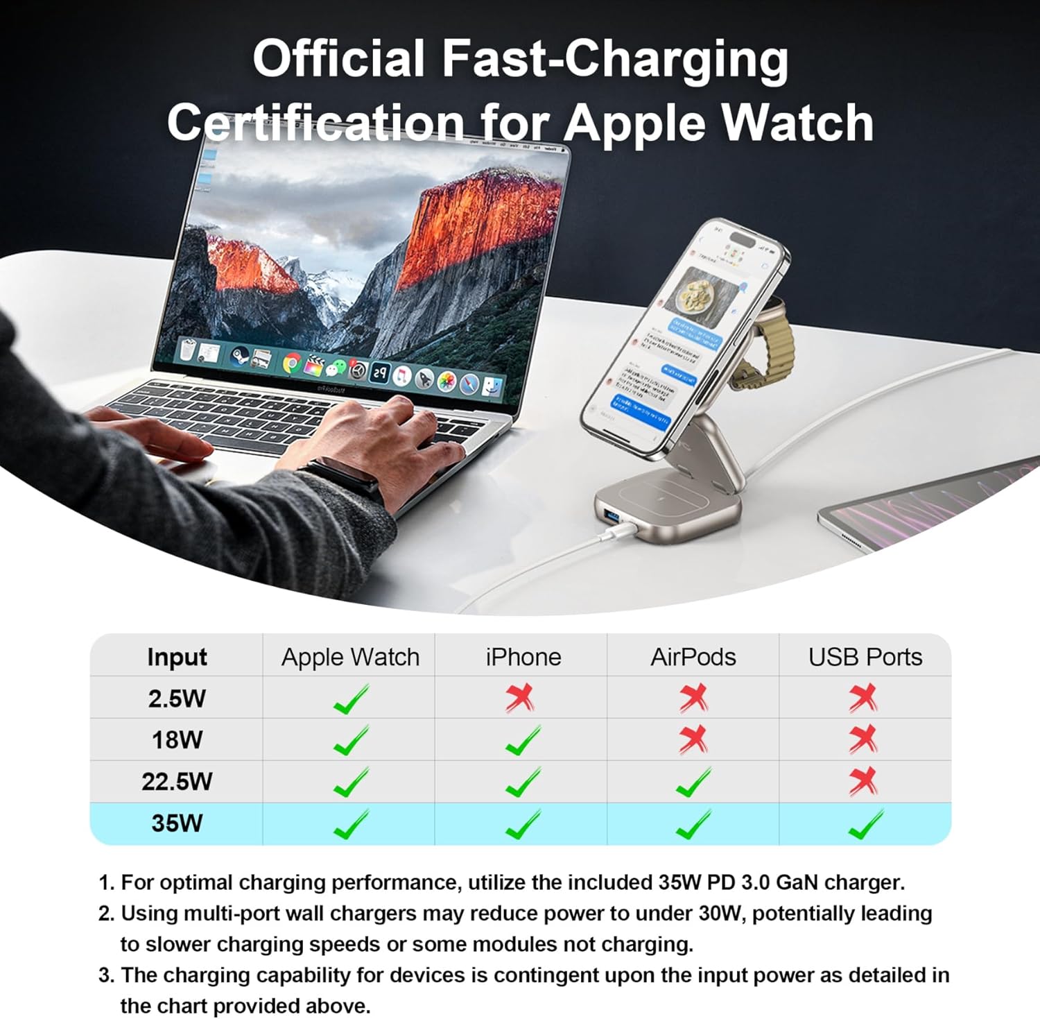 Exclusive 5-in-1 Upgrade for Apple: Transform your charging experience with our enhanced 3-in-1 charger, now in a sleek Titanium finish. Featuring added USB-C and USB-A ports, this station serves as a comprehensive charging solution for your iPhone, Apple Watch, AirPods, iPad, and even Android devices or power banks. Enjoy the convenience of simultaneous, full-speed charging for multiple devices/