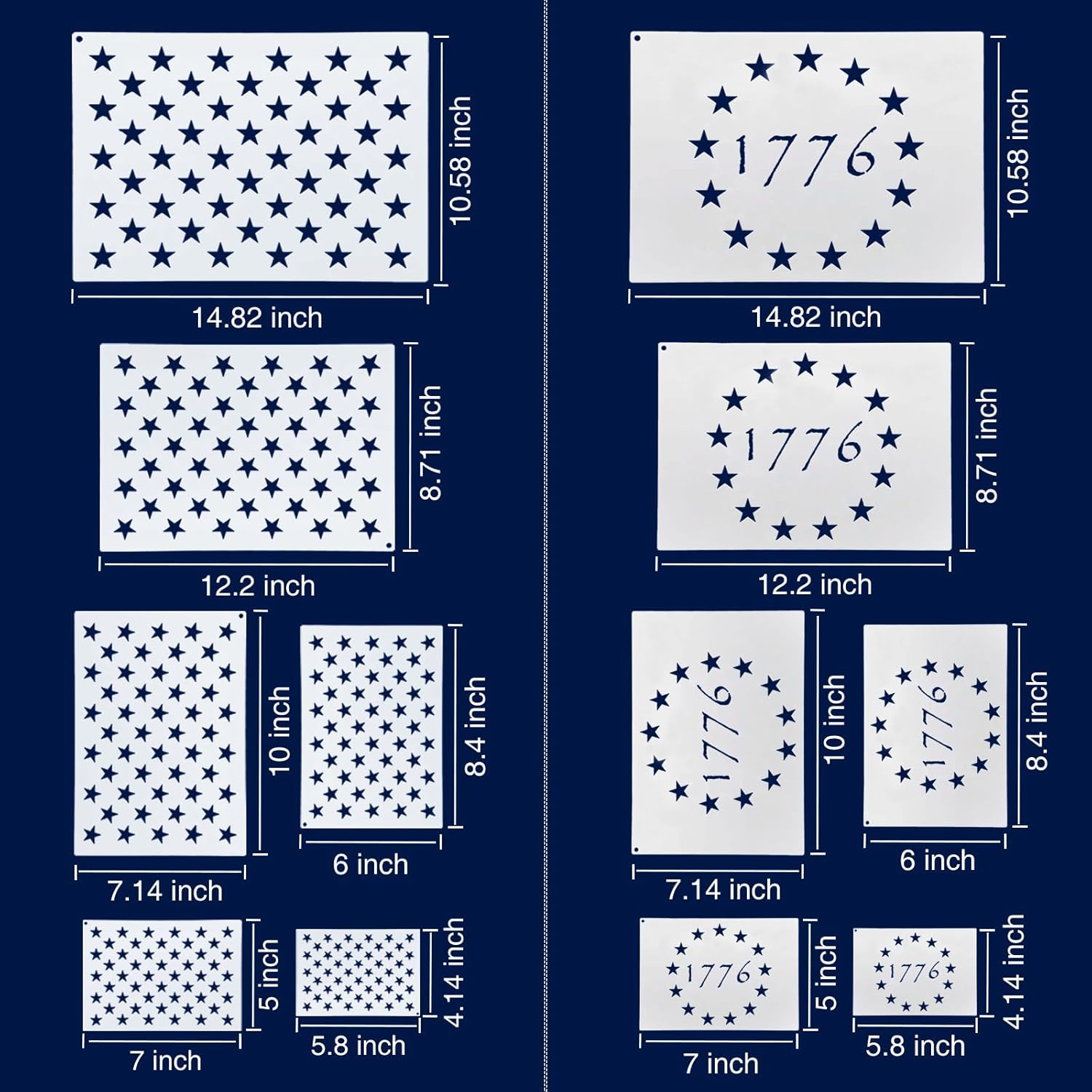 Value Package: You will get 12 pcs star stencils, include 6 pcs 1776 Templates and 6 pcs 50 star stencils. 6 sizes, 2 sheets of each size. These can meet any of your creative needs and show your imagination. Designed for long-lasting use purpose