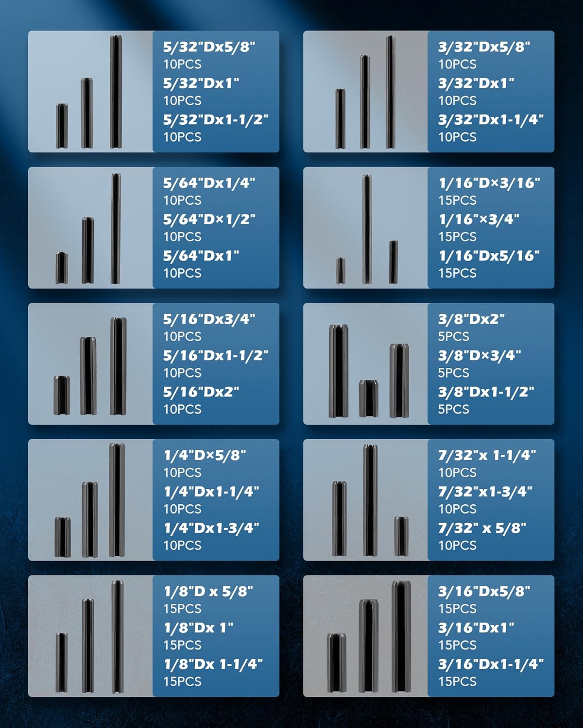 330-PIECE SET: This tool set includes 330 slotted spring pins in the most commonly needed SAE sizes—5/32″, 3/32″, 5/16″, 3/8″, 1/4″, 7/32″, 5/64″, 1/16″, 1/8″, and 3/16″—to help you deal with a wide range of fastening work