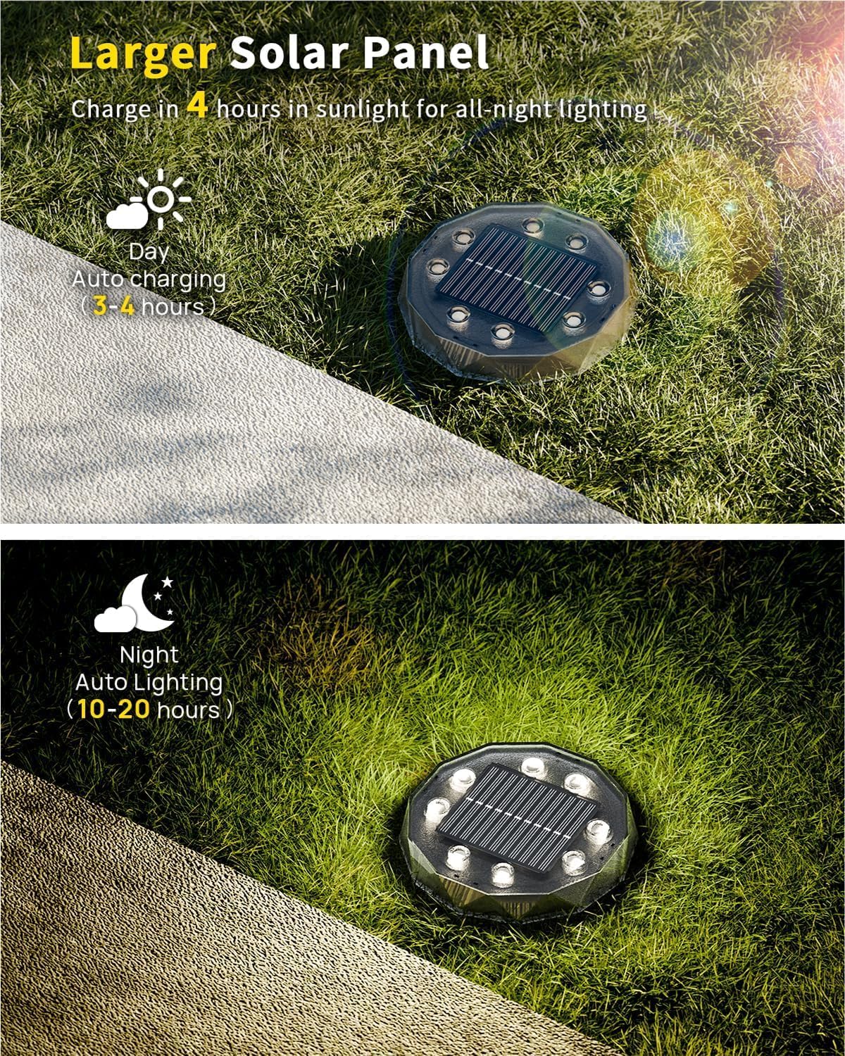 【Efficient & Eco-friendly Solar Lights for Outside】Each solar deck light has upgraded larger solar panel can convert sunlight into electricity 50% more efficiently than most other solar ground light. And it has 8 LEDs (RGBWW) , and equipped with lens emitting a more focused and intense beam of light and illuminating a wider area,more protect your eyes.10-20 hours runtime with 4-6 hours of sunshine, save energy and be eco-friendly. The solar light can light up all night for your garden.