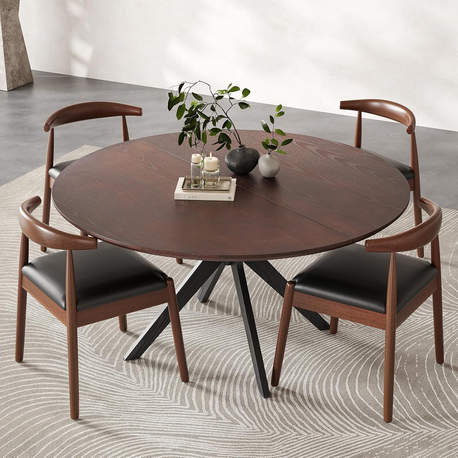 X-Shaped: The circle dining table boasts a unique pedestal base in an intersecting X-shape, not only lending a touch of novelty but also bolstering stability.