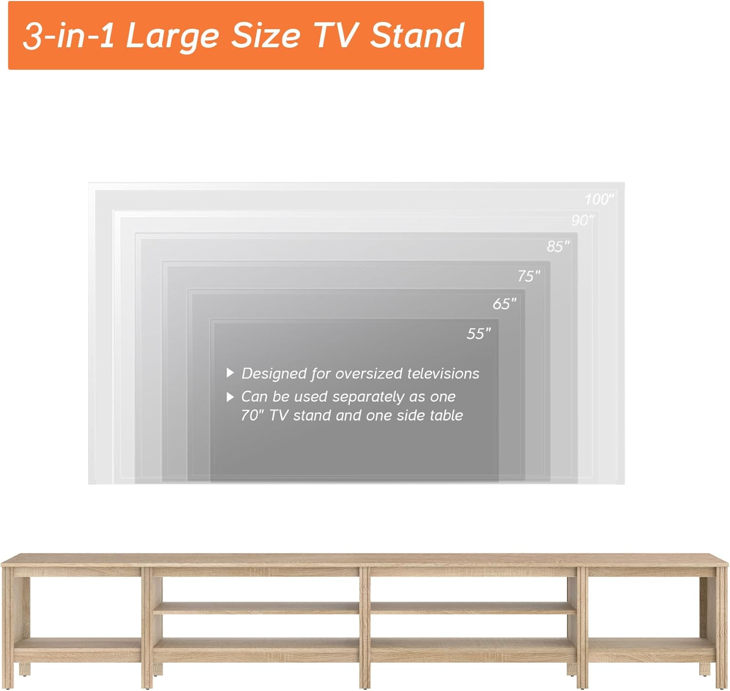 【Multi-in-1 Large Size TV Stand】Designed for 100+ inch TVs fits most 75 77 80 82 85 86 90 95 98 100 Inch TV screens.You could use them separately as a 23.6”nightstand and 35.4”side table, or use them together as a 60 inch tv stand, 70 inch media console, 95 inch tv table or 118 inch tv console meeting your various needs.With simple appearance,the practical tv console matche any style of room decoration perfectly.